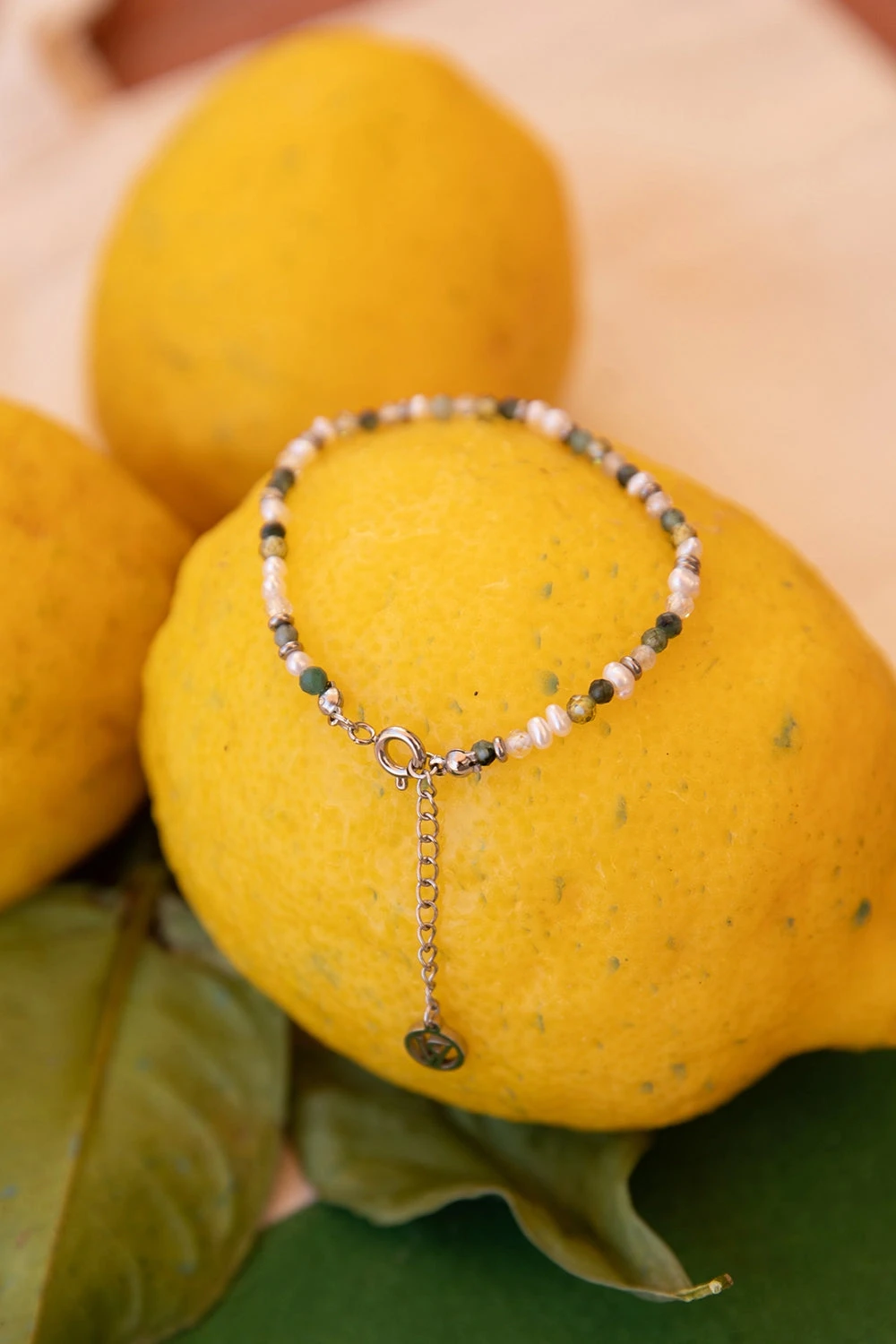 The Amalfi Green Bead Bracelet – a homage to Mediterranean flora. Drawing inspiration from nature’s colors, this bracelet captures the refreshing beauty of the Amalfi Coast. An accessory that accents your look with natural elegance. Available in Silver & Gold.