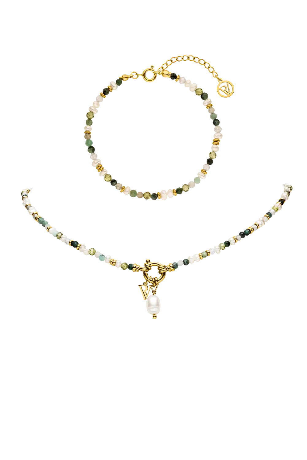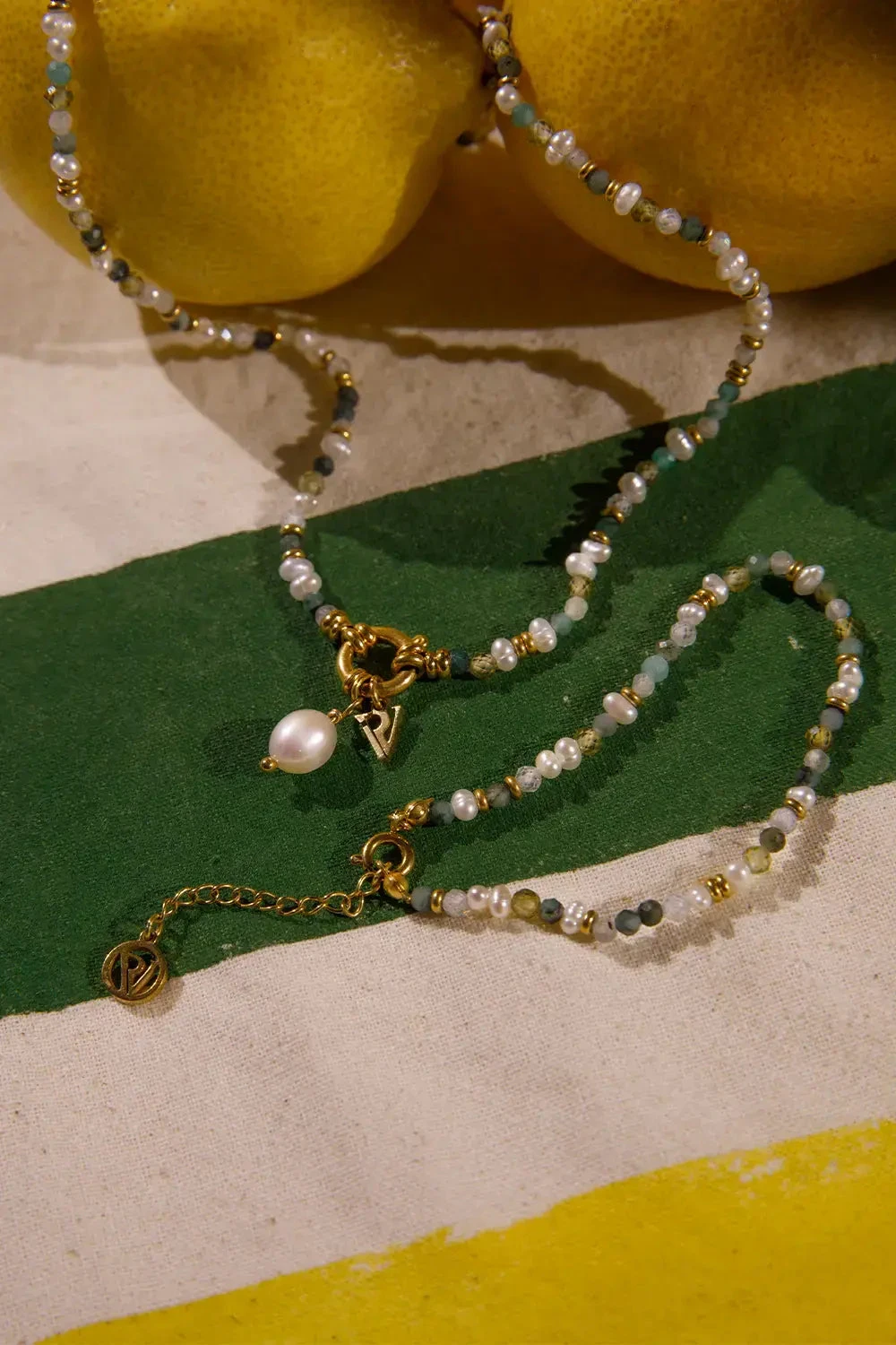 Experience freshness and elegance with the Amalfi Green Bead Necklace. Drawing inspiration from the colors of the Mediterranean flora, this necklace captures the natural beauty of the Amalfi Coast. The green beads add a revitalizing touch to your outfit. Available in Silver & Gold.