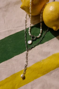Indulge in the elegance of the Amalfi Pearl Necklace. Inspired by the soft colors of the Amalfi Coast, these pearls capture the timeless beauty of the coast. The pearls subtly enhance your outfit, while the design echoes Mediterranean architecture. A piece that delicately accentuates your individuality. The set consists of the Amalfi Y-Necklace Silver and the Amalfi Pearl Necklace Silver. Available in Silver & Gold.