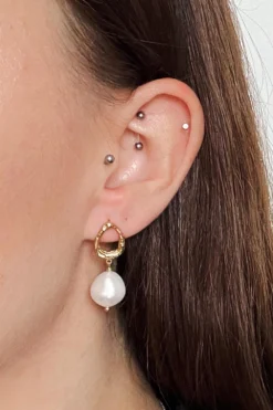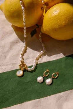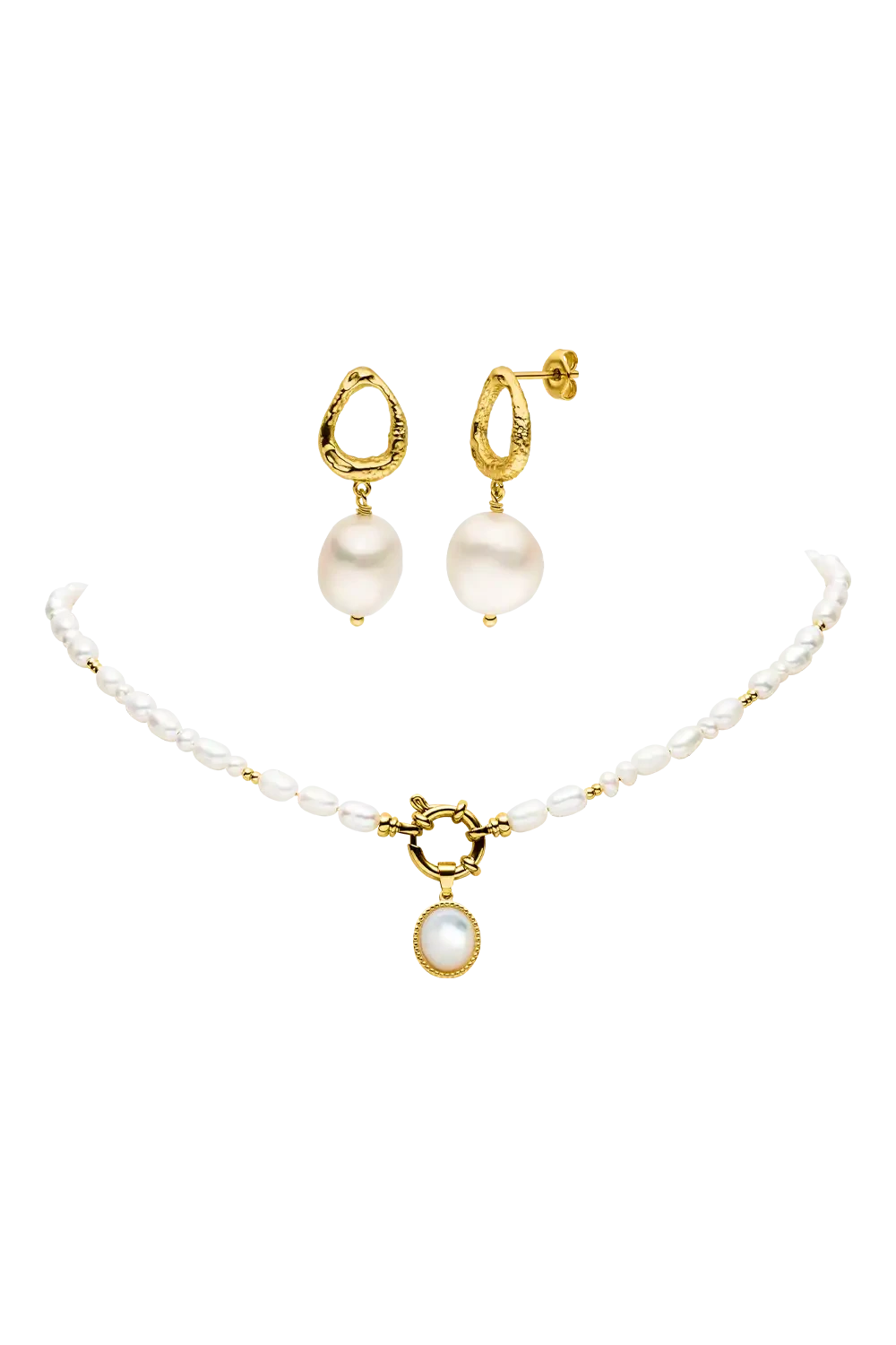 Indulge in the elegance of the Amalfi Pearl Necklace. Inspired by the soft colors of the Amalfi Coast, these pearls capture the timeless beauty of the coast. The pearls subtly enhance your outfit, while the design echoes Mediterranean architecture. A piece that delicately accentuates your individuality. The set consists of the Amalfi Pearl Necklace 14K Gold Plated and the Amalfi Pearl Earrings 14K Gold Plated. Available in Silver & Gold.