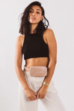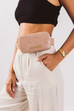 Strut culture and couture with Paul Valentine’s Amber Belt Bag. Crafted with a luxurious elegance, the Amber Belt Bag will complement your natural beauty, giving your look a soft, radiant appeal. Designed with a pink croco embossed casing made from the best Faux Leather and encrusted with our Paul Valentine logo, this belt bag will undoubtedly become an everyday accessory of yours. Some of the many joys of the belt bag? It is lightweight and easy to wear, enabling you to pack your smartphone, keys and cards with ease. The Amber Belt Bag is also available multiple colours and sizes and includes an adjustable strap for ultimate comfort.