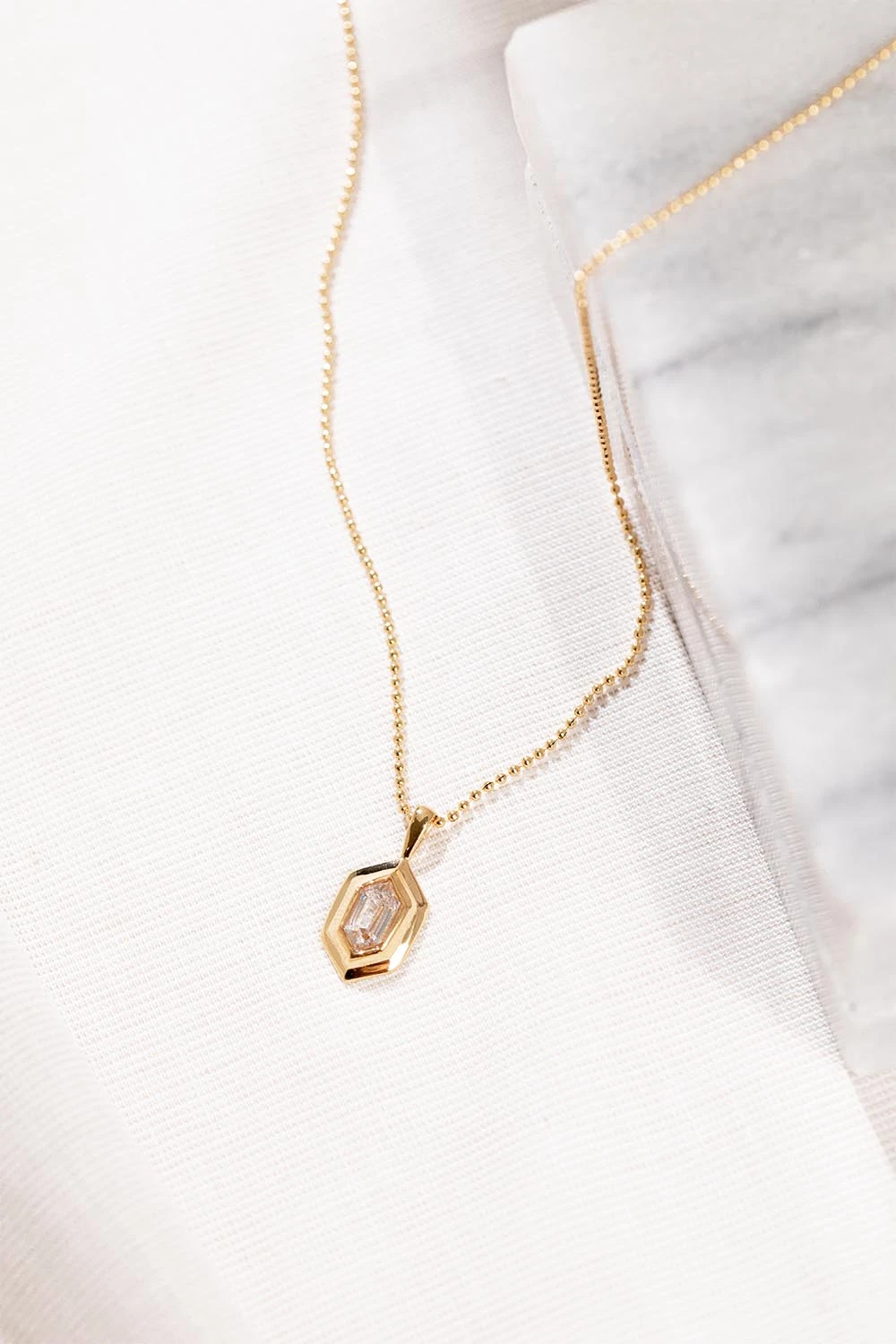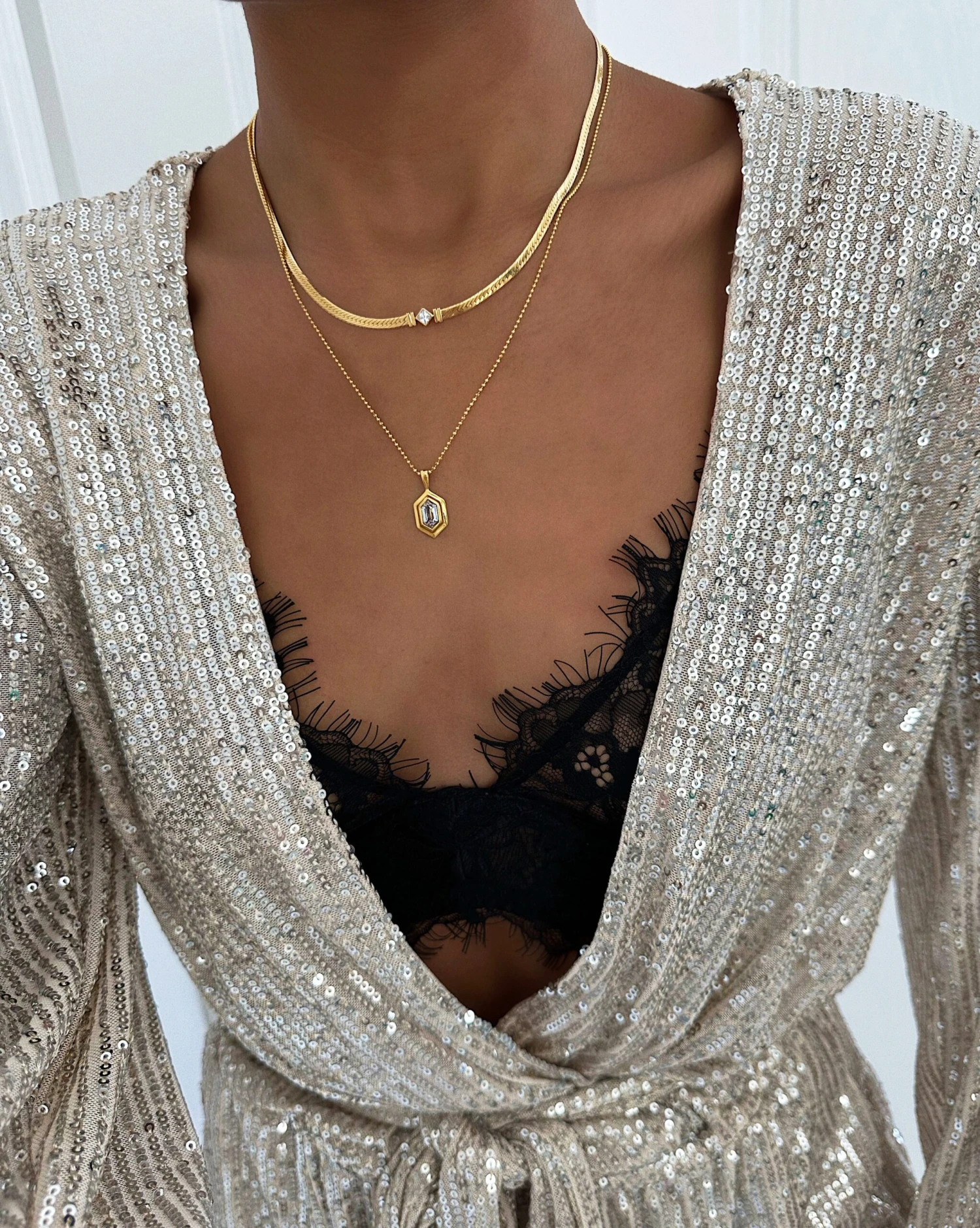 Create the perfect layering this summer: Our Dream Necklace is the perfect piece to highlight your neckline. A delicate simple chain combined with a hexagonal pendant with a large zirconia stone looks great in combination with a shorter piece like the Dream Sleek Necklace from the Summer Dreaming collection. Your perfect layering is waiting! Available in silver and gold.