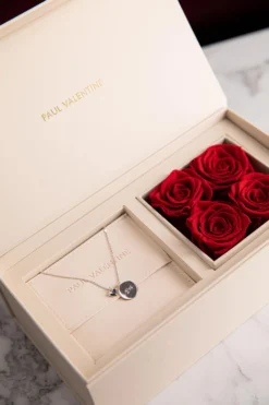 The Engravable Heart Rose Box features a beautiful necklace with a small heart pendant and a larger pendant with space to engrave a special meaning – a perfect gift to share your story with someone special! Plus, your gift comes with four natural Infinity Roses, which last up to 2 years without water. Infinity Roses are real roses that have been gently preserved. As this is a natural product and each rose box is unique, the colour and shape of the roses may vary slightly. Available in silver and with 14K gold plating.