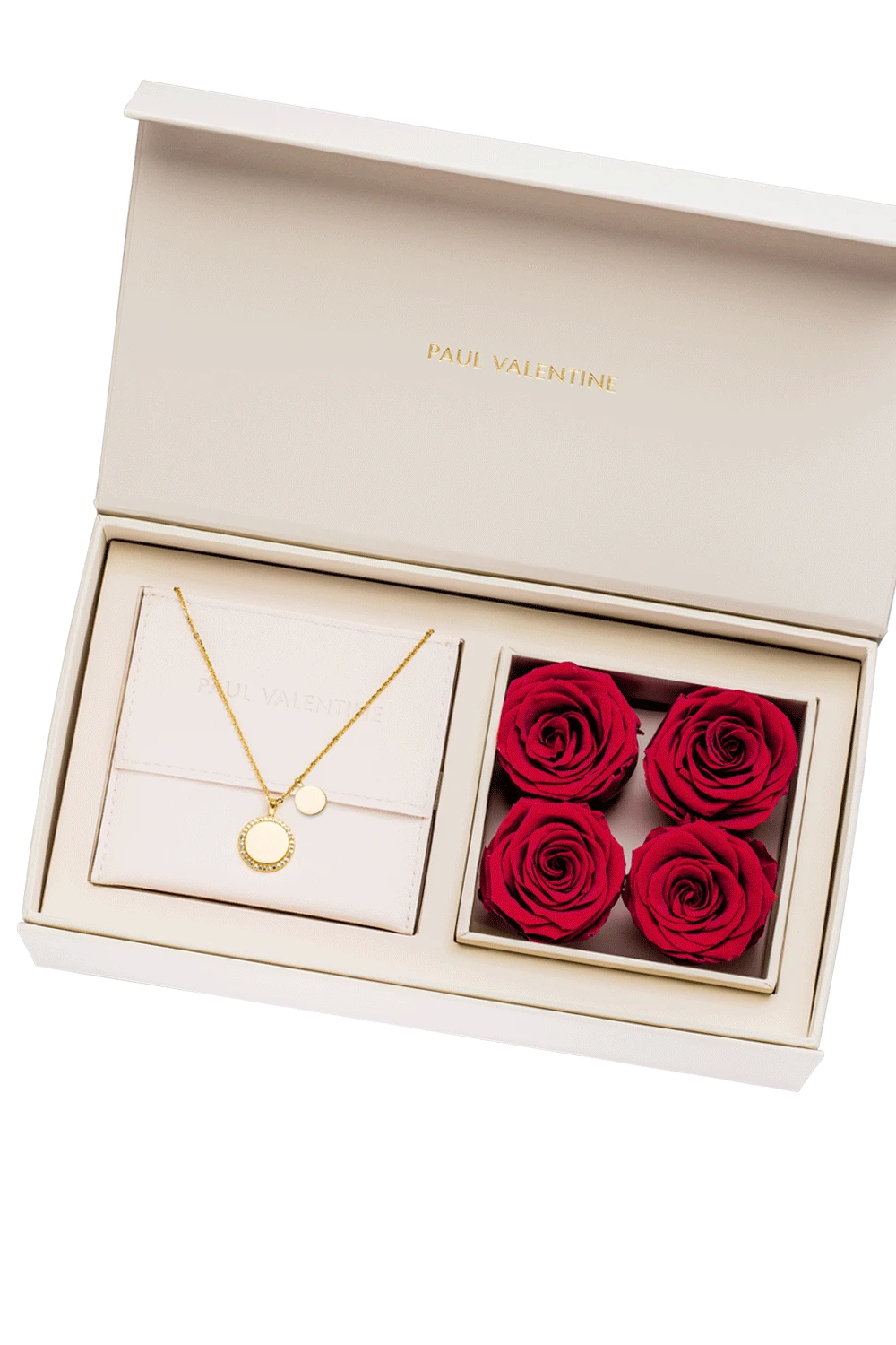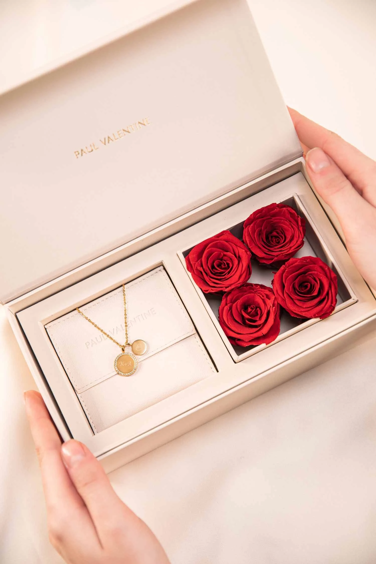Celebrate your love by choosing this timeless necklace with a double pendant that you can engrave with your love story. Maybe a name, initials, or a special date? Our perfectly designed Rose Box contains four natural Infinity Roses. These can be taken out and used as a home accessory while lasting up to 2 years. No water or care needed.
