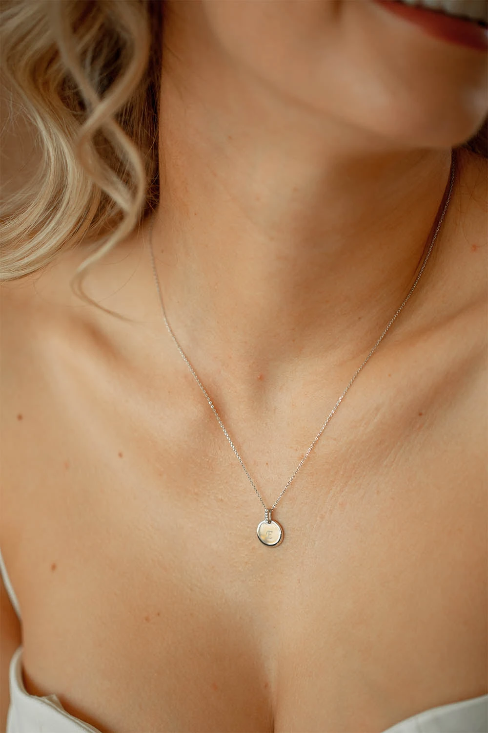 Meet our Engravable Round Pavé Necklace: an elegant layering necklace that serves as a perfect daily reminder of your favourite memory, person, or pet! You can engrave a name, initials, or a number on the plate (up to 3 characters). Looking for a gift for your girlfriend, mother, or daughter? This is a thoughtful gift for someone you love. The size of the engraving shown in the picture is for reference only – the size of the actual engraving may differ slightly. Available in silver and 14k gold plating.