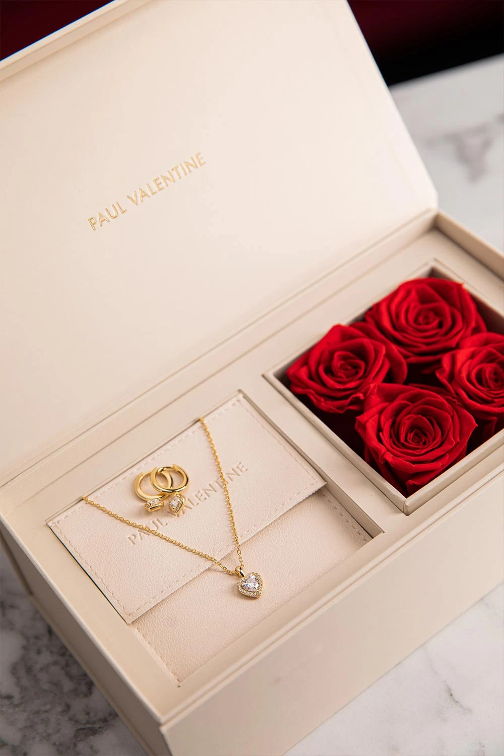 Handcrafted with love, this set featuring the Glamorous Heart Necklace and the Glamorous Heart Huggies is the perfect way to show your love to someone special. Our perfectly designed Rose Box contains four natural Infinity Roses, which last up to 2 years without water. Infinity Roses are real roses that have been gently preserved. As this is a natural product and each rose box is unique, the colour and shape of the roses may vary slightly.