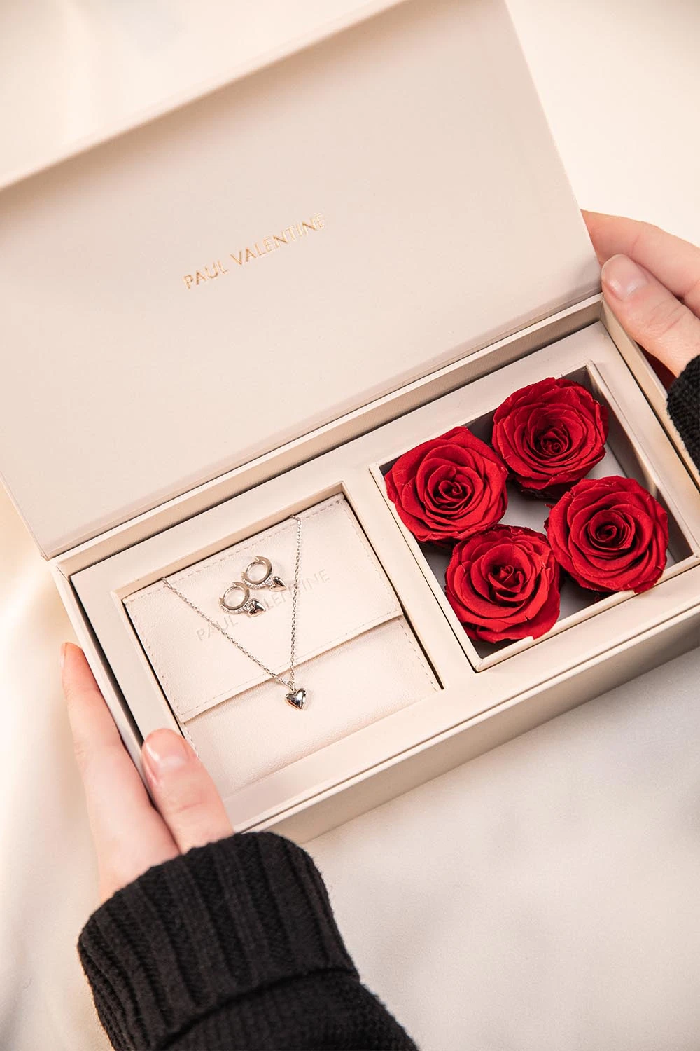 Pretty Rose Box meets stunning set: made up of our Brass Heart Necklace and our Brass Huggie Hoops lined with beautiful tiny zirconia stones this one is for a lady who likes it romantic yet playful! Our perfectly designed Rose Box contains four natural Infinity Roses. These can be taken out and used as a home accessory while lasting up to 2 years. No water or care needed.