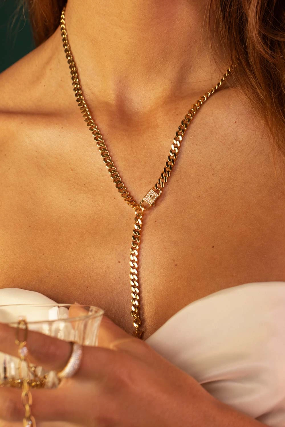 A Y-Necklace should be a staple in every girl’s jewelry wardrobe. Meet the all new Link Pavé Y-Necklace: a sleek shiny chain, tiny cubic zirconia stones, and a beautifully minimalist design – a grandiose ensemble when paired with a shorter chain, but also a stunner when worn solo. Pssst… makes for a phenomenal gift for a pretty lady in your life! Available in gold, silver, and rose gold.