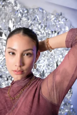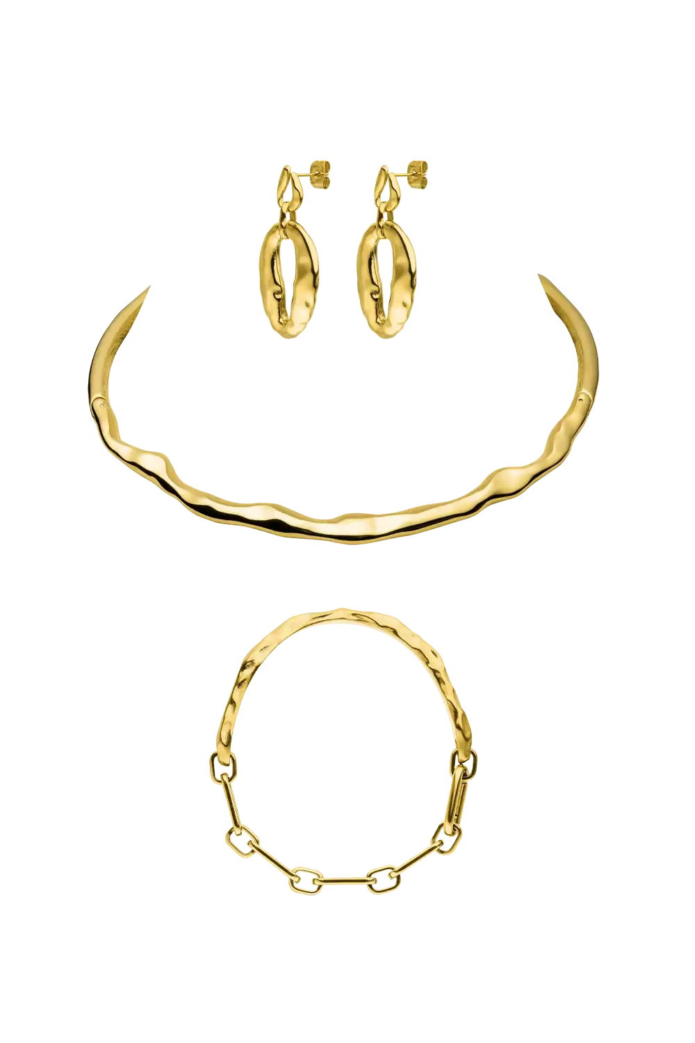 Discover the Galactic Ensemble from our Space Safari collection – a bold statement of cosmic elegance! This bundle includes the Molten Choker, the Molten Bangle Bracelet and the Molten Statement Earrings. The jewelry pieces with futuristic design are inspired by the shapes of outer space and attract everyone’s attention with their unique surface structure. Available in gold and silver. Get this ensemble and immerse yourself in the mystical beauty of the universe – perfect for special occasions.