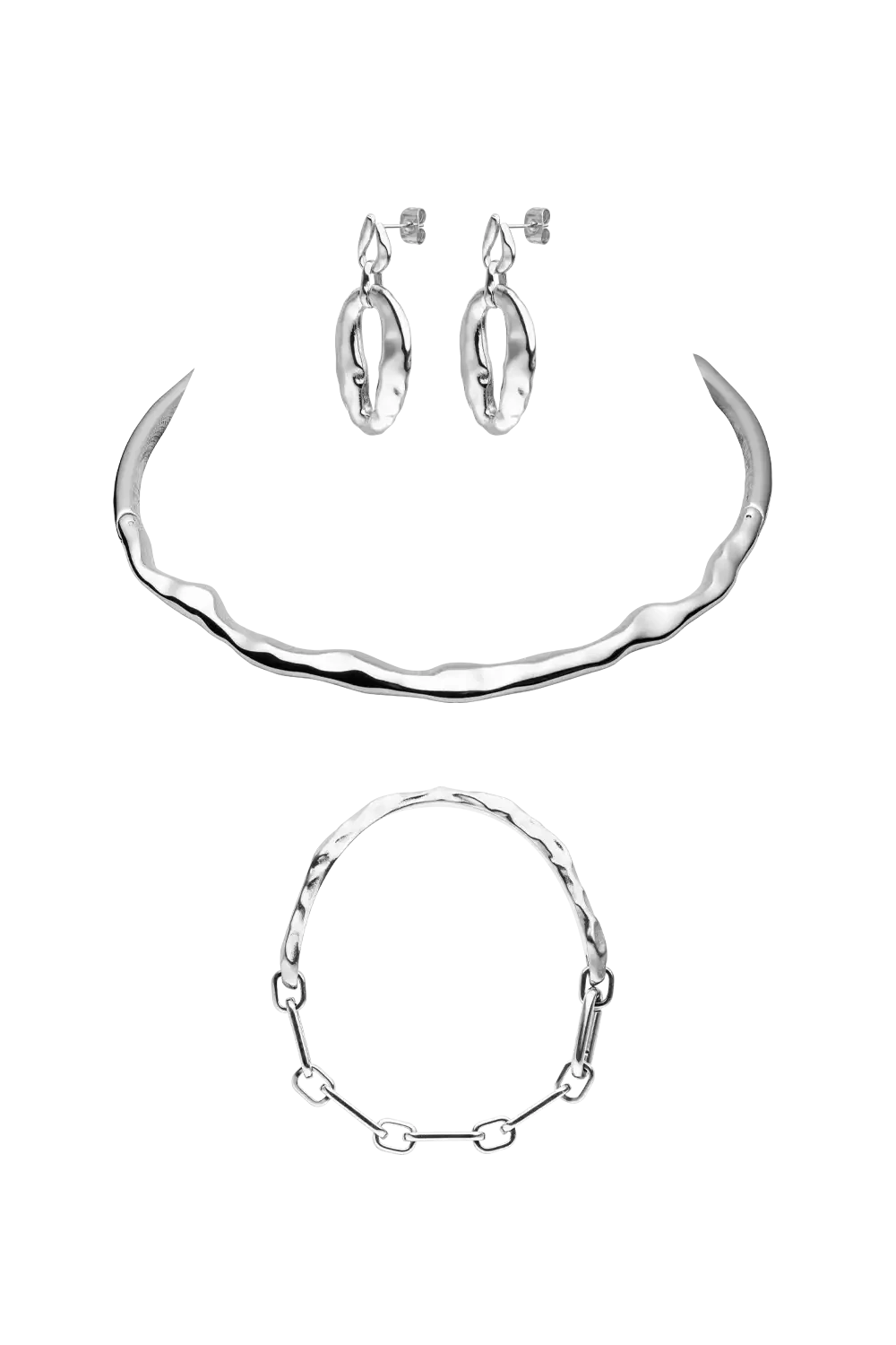 Discover the Galactic Ensemble from our Space Safari collection – a bold statement of cosmic elegance! This bundle includes the Molten Choker, the Molten Bangle Bracelet and the Molten Statement Earrings. The jewelry pieces with futuristic design are inspired by the shapes of outer space and attract everyone’s attention with their unique surface structure. Available in gold and silver. Get this ensemble and immerse yourself in the mystical beauty of the universe – perfect for special occasions.