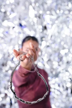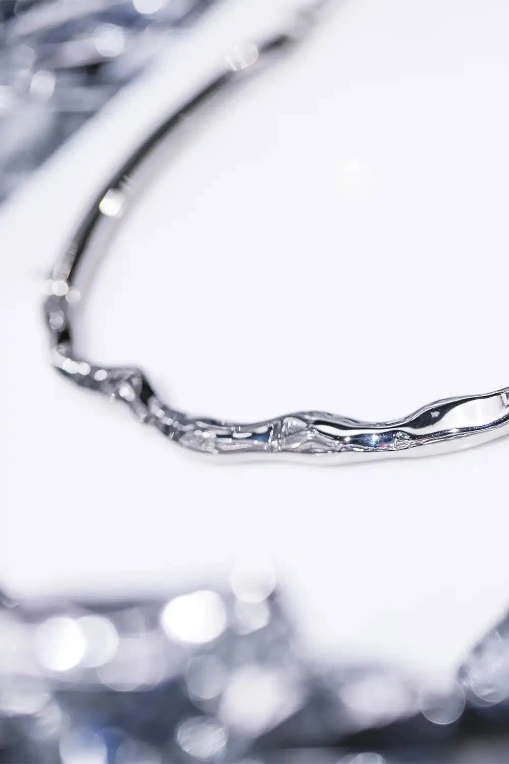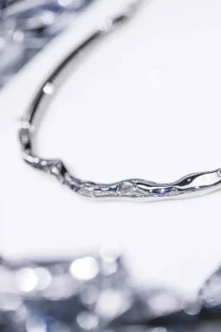 The Molten Choker from the Space Safari collection is a bold statement piece. Inspired by the shapes, colors and mysticism of outer space, this choker combines coarse-meshed links and an element with a moon-like structure to create a futuristic design. The special design of the piece of jewelry captures the extraterrestrial aesthetic. It is an expression of cosmic elegance and timeless beauty, perfect for special occasions. Available in gold and silver.