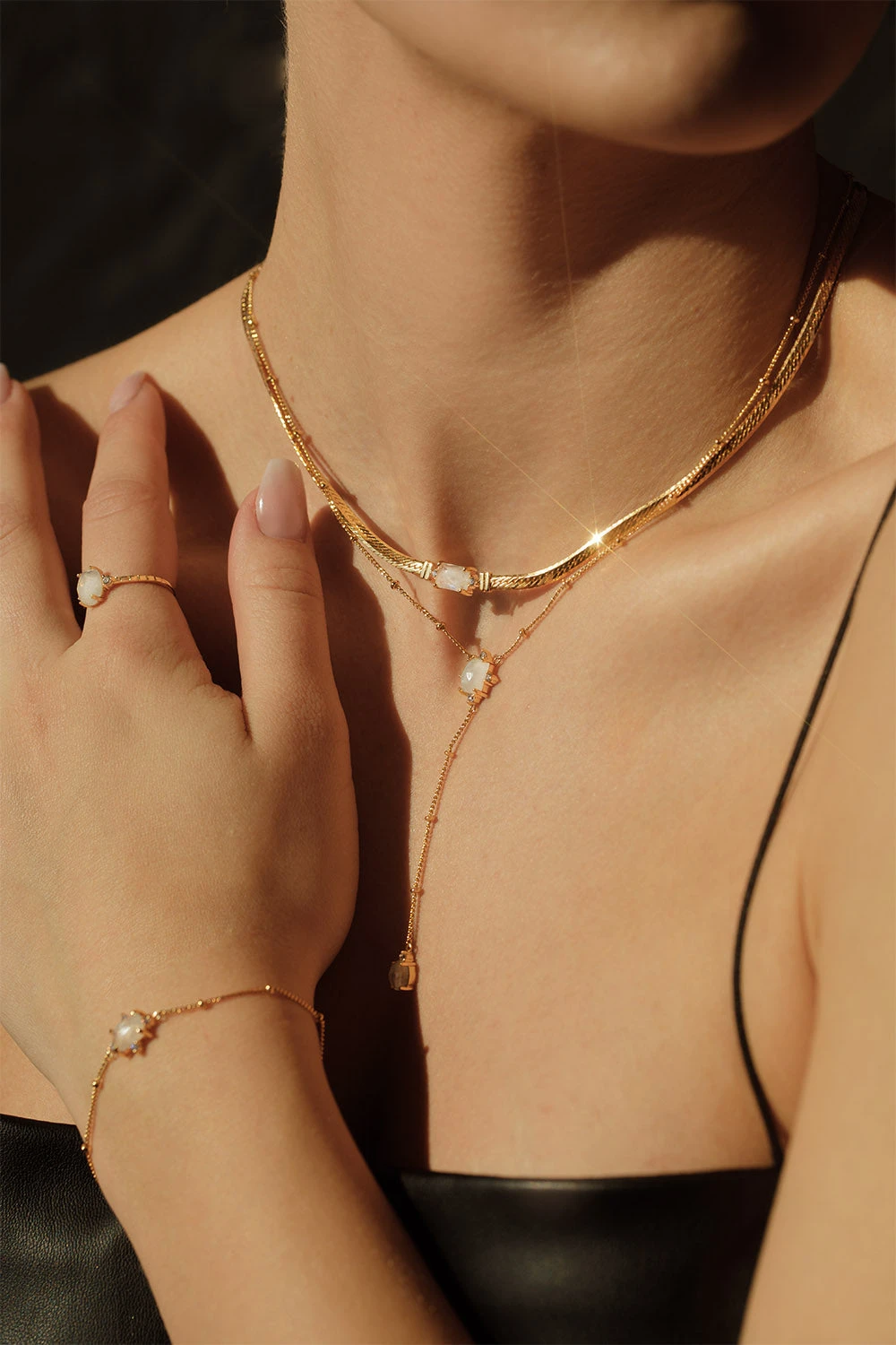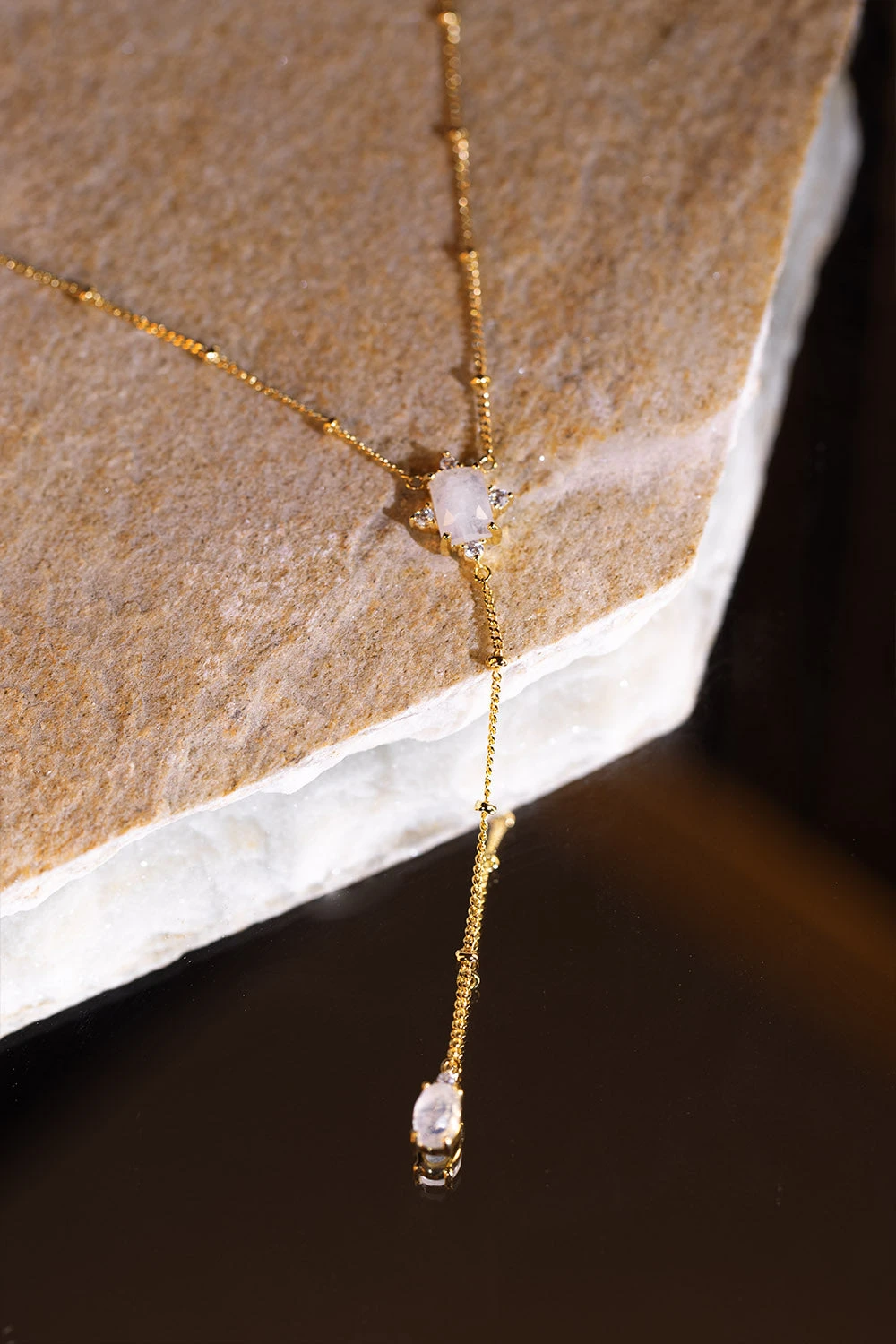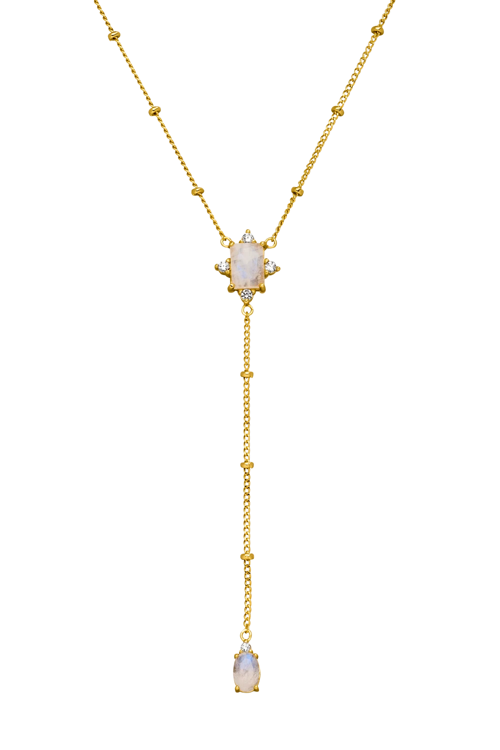 The Moonstone Intuition Y-Necklace is a remarkable piece thanks to its unique design, subtle elegance and delicate chain. The two white moonstones sparkle and draw attention to your neckline. The beautifully sparkling moonstone owes its name to the Greek moon goddess Selene, because its shimmer is reminiscent of mysterious moonlight and is supposed to strengthen our intuitive powers. If you like to create layerings, you can combine our Moonstone Intuition Y-Necklace with a shorter necklace like the Moonstone Intuition Choker. They are a match made in heaven! Available in silver and 14k gold plating.