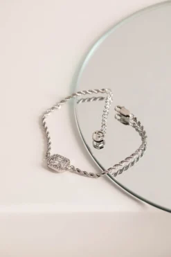 Discover our Pavé Emerald Bracelet – an elegant bracelet with a touch of vintage. A large white zirconia stone is the sparkling centrepiece of this beautiful pendant, paired with a twisted chain and a little edgy twist. The large zirconia stone is lined with countless tiny zirconia stones, bringing subtle elegance and shine. Made from recycled stainless steel with a 14K gold or ion silver plating.