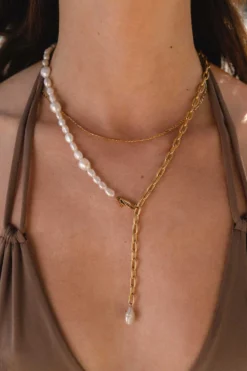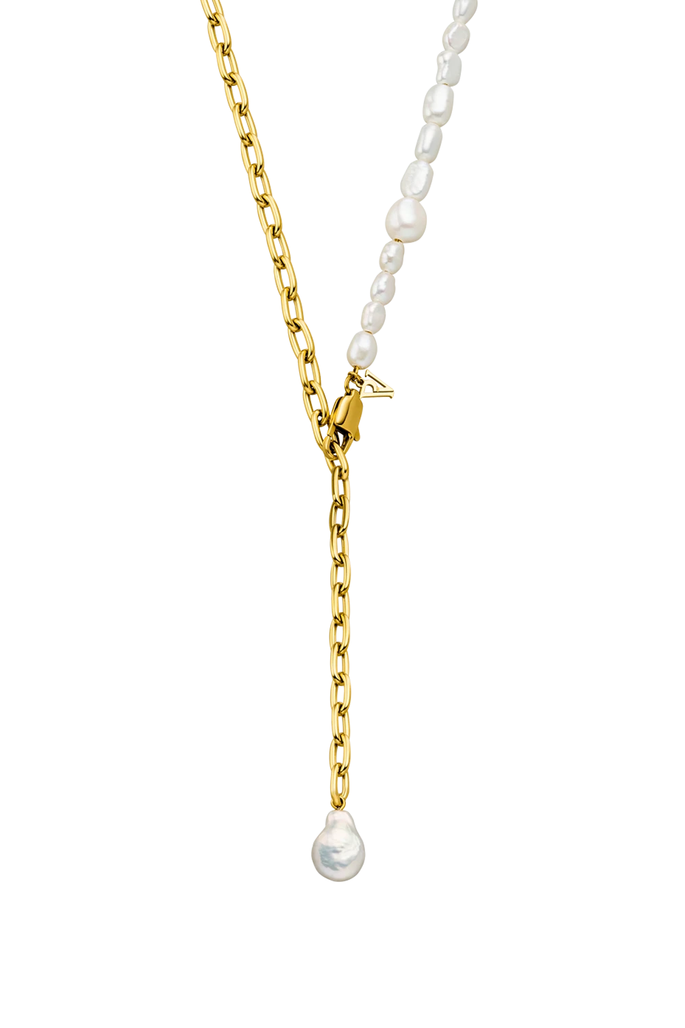 Summer vibes are on the way! Our Pearl and Chain Connection Necklace in gold/silver with an entire row of authentic small and large freshwater pearls is a statement piece – an absolute must in your summer wardrobe. Feel connected to the ocean by carrying your own set of unique pearls close to your heart. Light and elegant with a real luxury vibe.