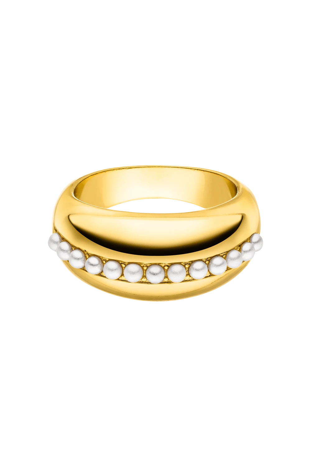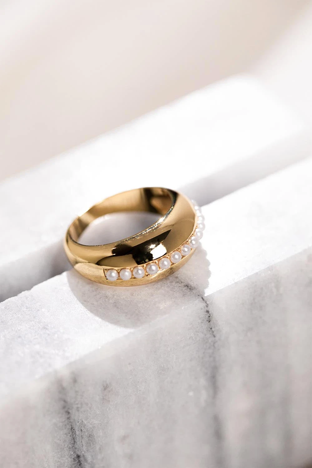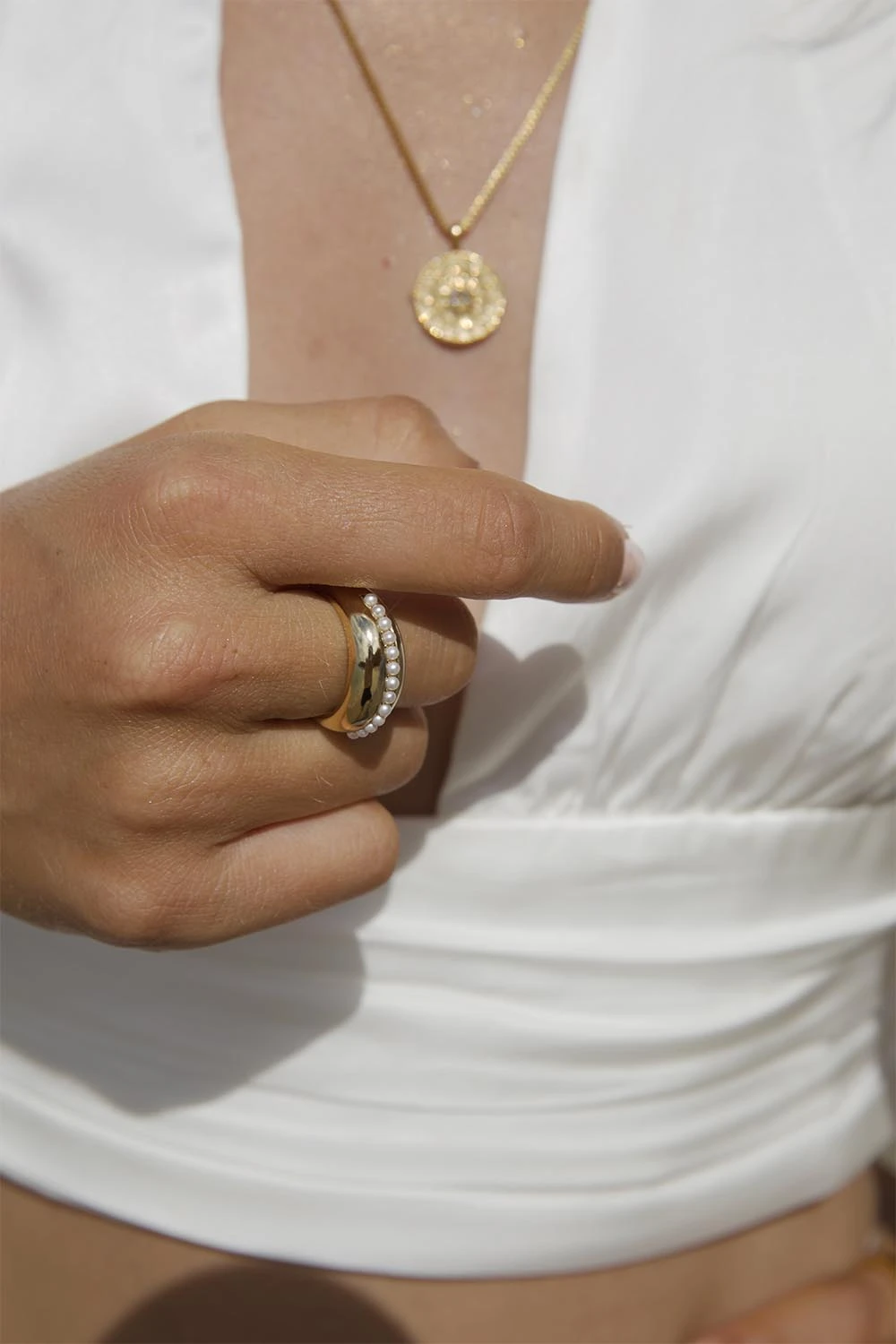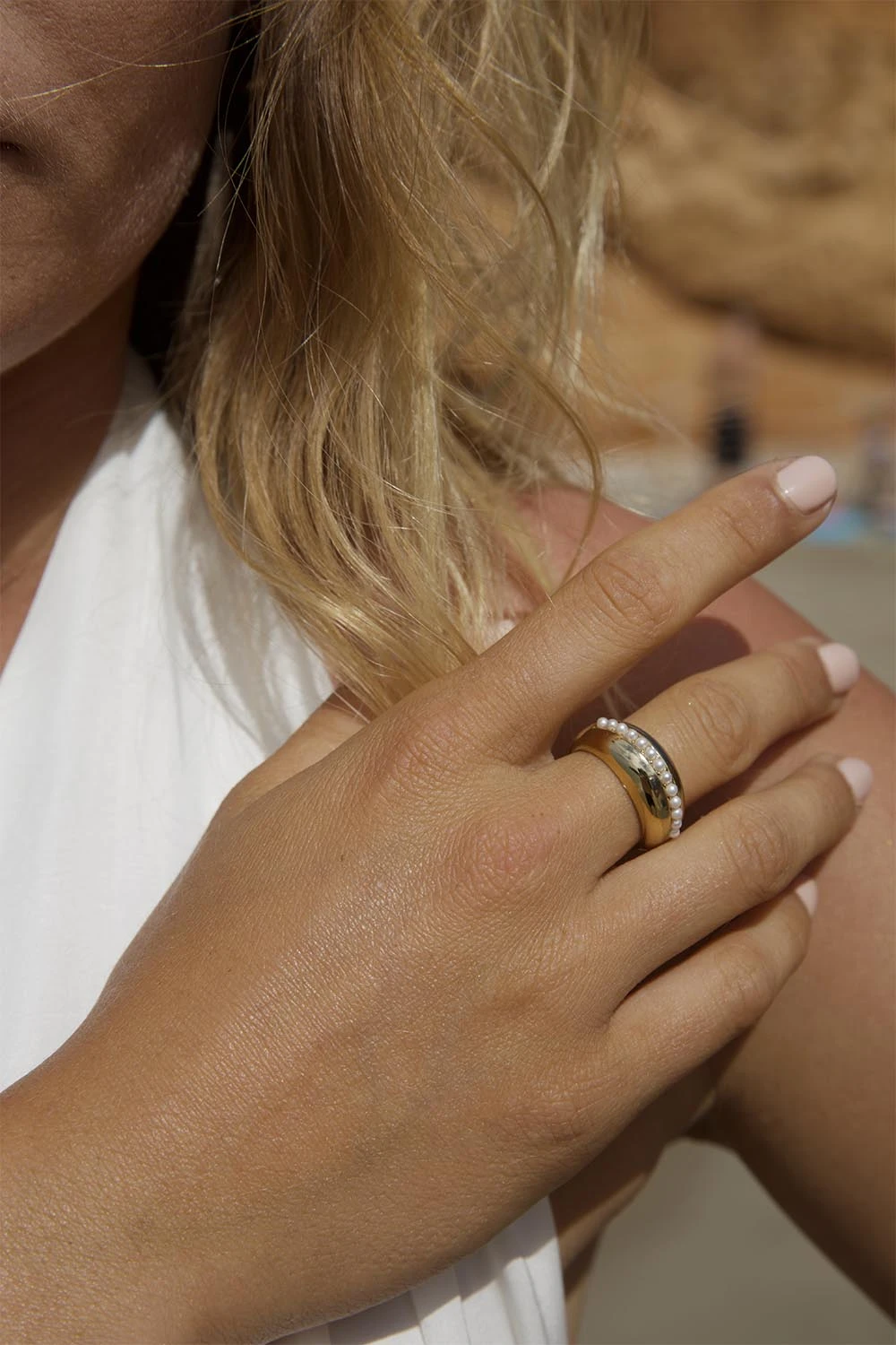 A summer dream made of pearls and gold: discover our chunky Pearl Ring with authentic freshwater pearls, a true statement ring! It feels lightweight on your hand, and its delicate pearls bring a touch of luxury to any outfit. A thick layer of 14k gold plating makes it fully waterproof, tarnish-free, and a perfect companion for your summer. Start chasing those dreams now!
