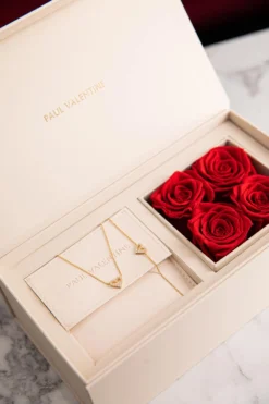 Handcrafted with love, this set featuring the Radiant Heart Necklace and the Radiant Heart Bracelet is the perfect way to show your love to someone special. Our perfectly designed Rose Box contains four natural Infinity Roses, which last up to 2 years without water. Infinity Roses are real roses that have been gently preserved. As this is a natural product and each rose box is unique, the colour and shape of the roses may vary slightly.