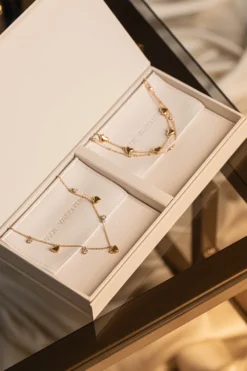 The beautiful Heart Giftbox consists of the elegant Shining Heart Necklace and the perfectly matching Shining Heart Bracelet – a classy set for the modern woman! Let her feel your love as she unwraps this special gift and knows this jewelry will last her a lifetime. Plus, it will remind her of you every single day! Here to treat yourself? Go for it, girl! You deserve it all. Available in 14k plated gold and silver.
